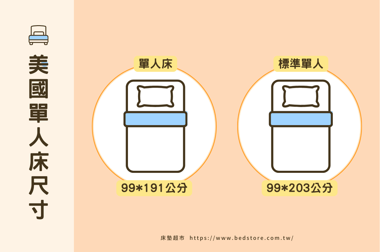| 標準單人床 | 3.5 尺 | 106公分 x 188公分 | 3.5尺 x 6.2尺 |